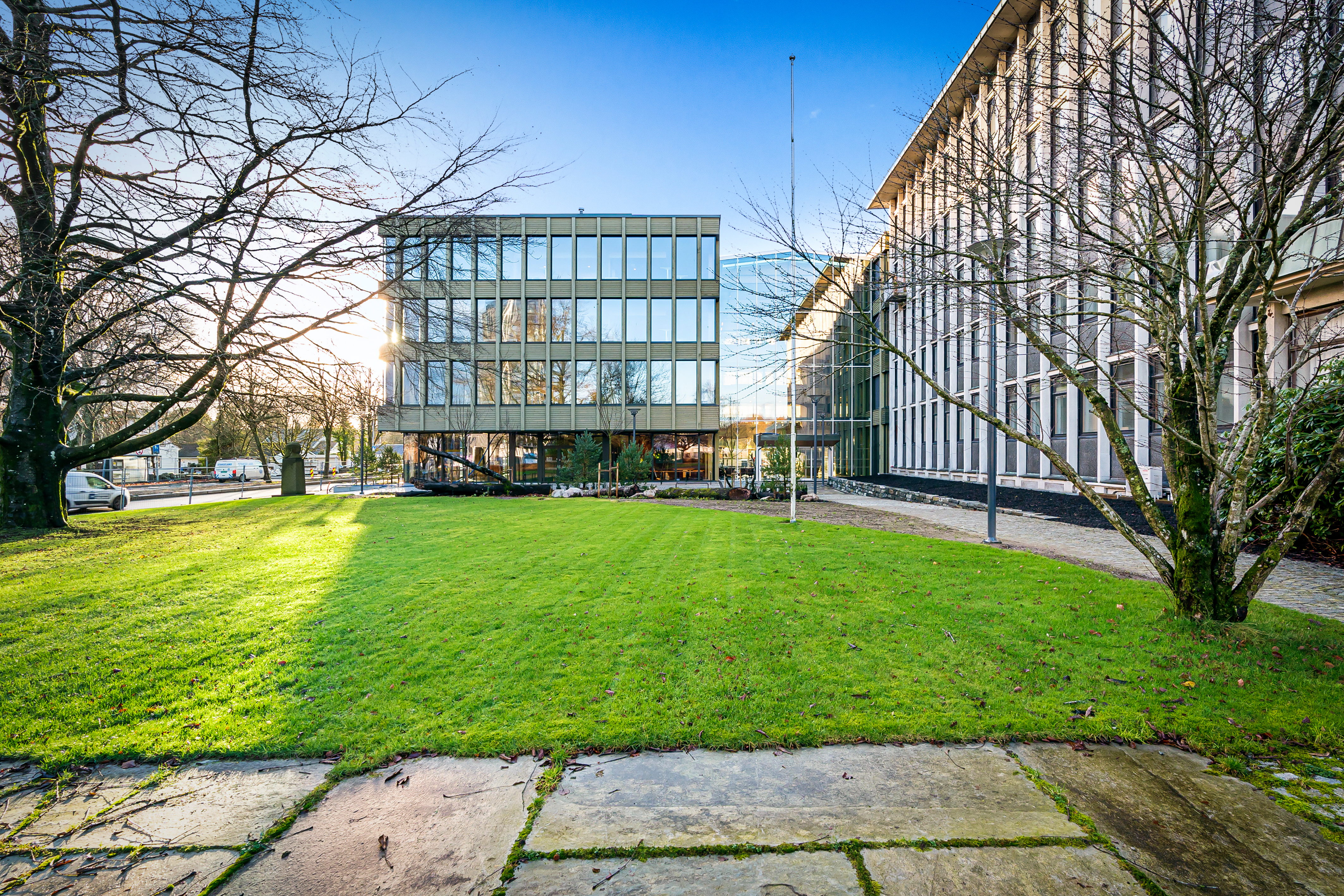 Det nye bygget består av tre bygningskropper fordelt på to massivtre-bygg, med en stor glass-foaje midt mellom som også binder det gamle rådhusbygget sammen med nybygget. Foajéen domineres av en hovedtrapp i eik, og denne trappen er bygget rundt en massivtre-kjerne. Etasjeskillene er dekket med grus, mineralull og fem centimeter påstøp. Disse installasjonene fungerer svært godt til å fange opp lyd, og gir vekt som tynger ned bygget og forebygger vibrasjoner. Søyler og bjelkesystem er i limtre, rømningsveier i massivtre, mens innsiden av ytterveggene er kledd med eik. Bygget er i dag blitt et flott bygg i massivtre som rommer 250 kontorarbeidsplasser.